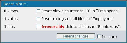 You can reset the number of views count and total ratings in the album properties panel and even delete all pics at once in the sub-section "Reset album" by ticking the desired checkboxes and then submitting the form. To prevent accidental resets, you will have to place a tick on the checkbox "I'm sure" before changes can be submitted (the button will be greyed out (disabled) if you don't).